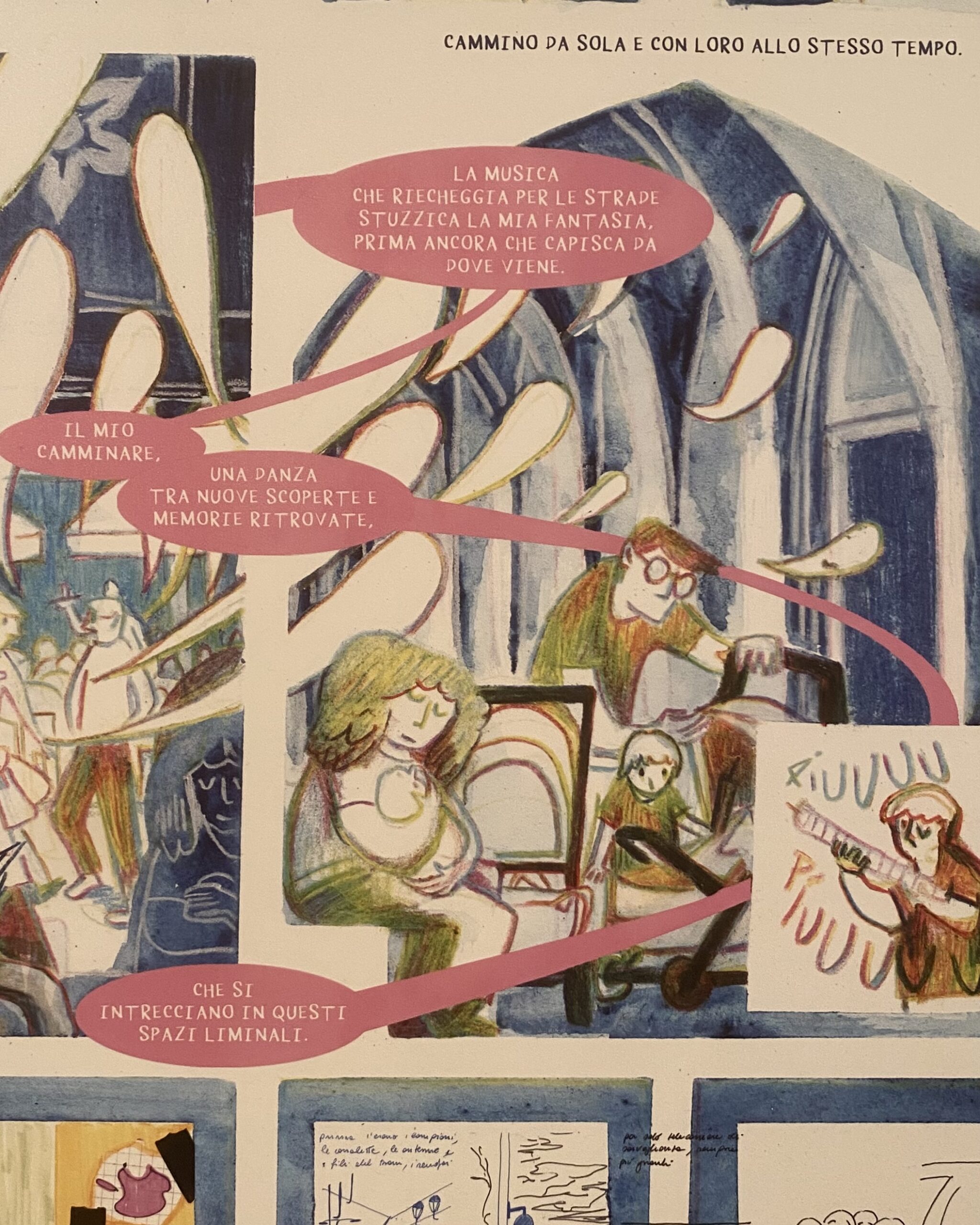The sketchbook is a meeting place where drawing, gaze, and city intertwine, finding a shared graphic language. Here the first steps are taken so that notes made while walking and observing can later become a story; here fragments of the narrative are collected and then recomposed into intricate paths.